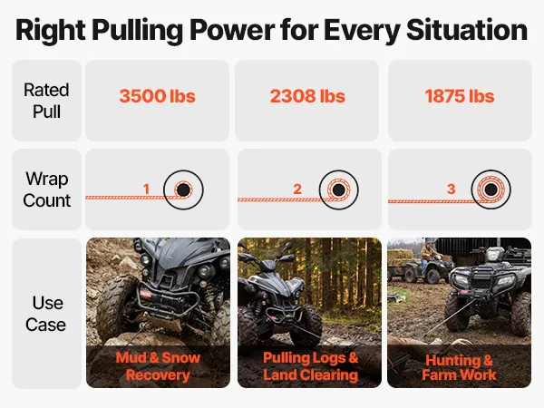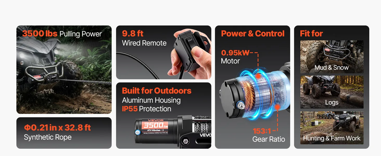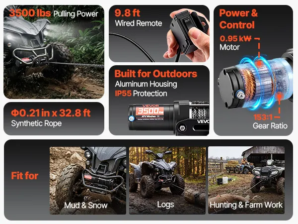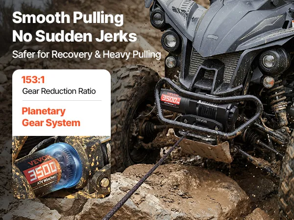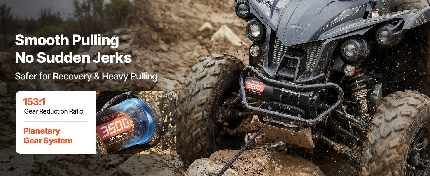Powerful Performance: Powered by a 1.3 HP permanent magnet motor, this electric winch delivers a steady 3500 lbs pulling capacity. The 153:1 high gear reduction efficiently converts power into strong torque, helping the atv winch pull out of tough spots