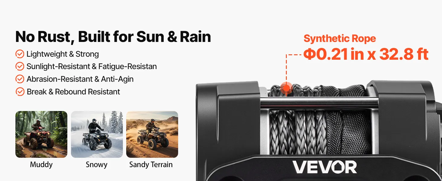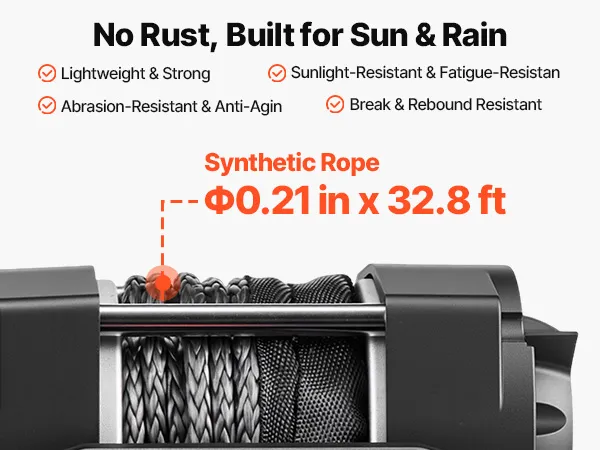 Reliable Pulling Strength: Equipped with a multi-strand UHMWPE synthetic rope, 0.21 in in diameter and 32.8 ft long. Lightweight yet strong, this small winch rope resists wear and aging, reduces snapback risk, and offers recovery performance in outdoor
