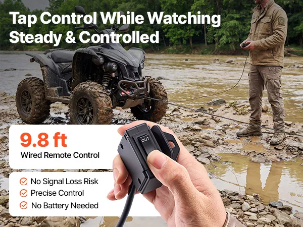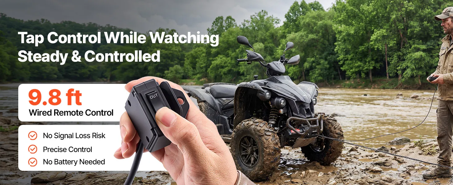 Precise Wired Control: Includes a 9.8 ft wired remote for direct, responsive operation without signal interference. Ideal for close-range, controlled recovery tasks, this 12 volt winch allows you to observe and fine-tune each pull with confidence