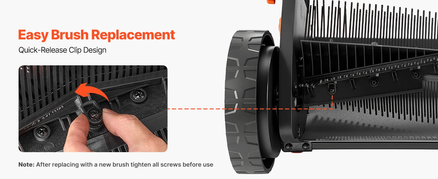Quick & Easy Installation: The lawn sweeper brush head features a tool-free quick-release brush mounting system. Simply loosen the retaining screw, rotate the latch, and remove the old brush. Fast replacement saves time and gets your lawn sweeper back to work