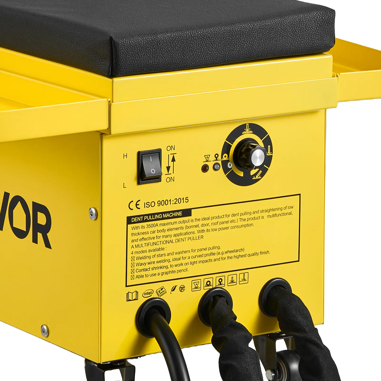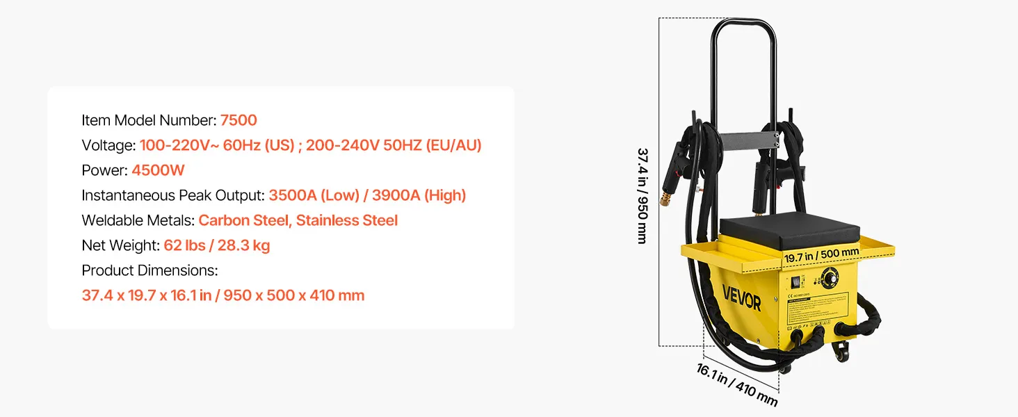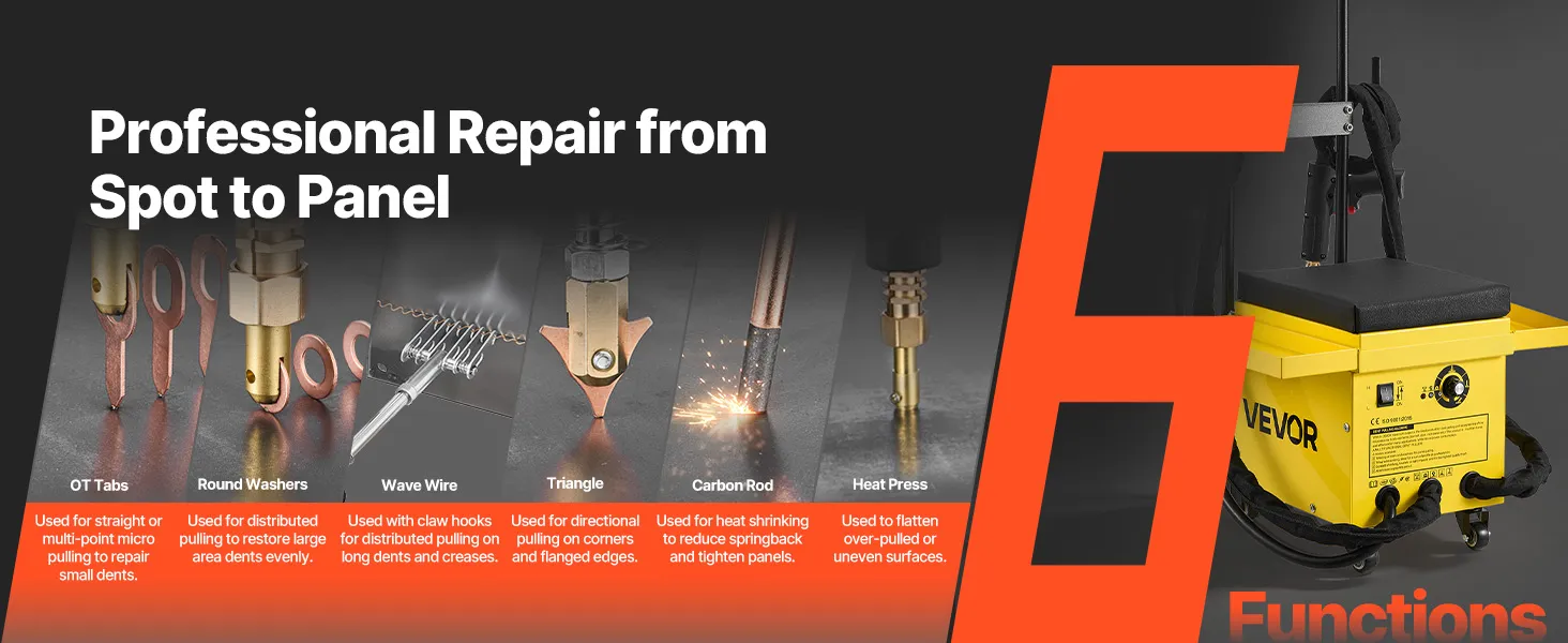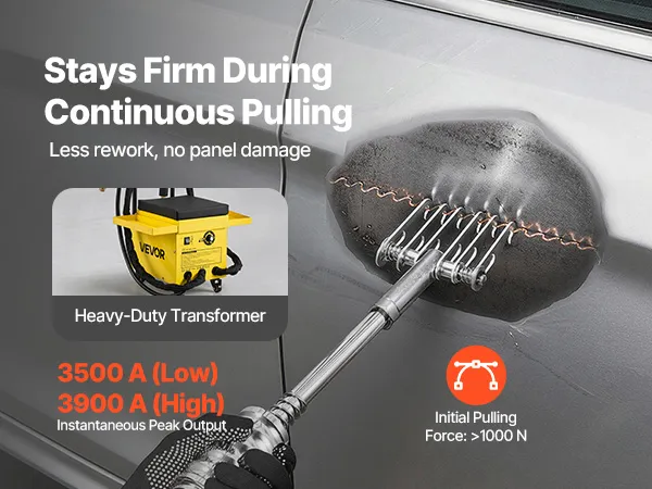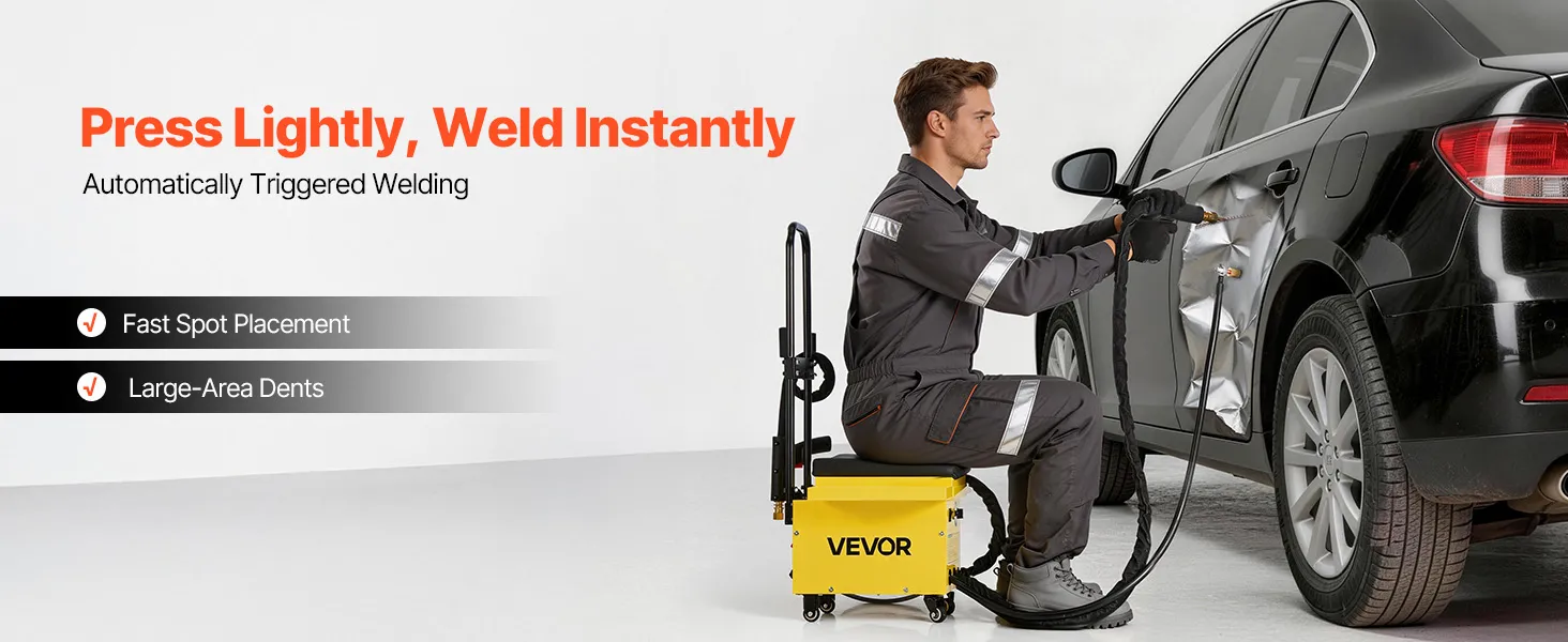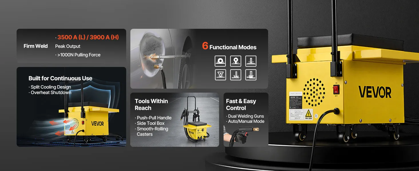 Featuring 6 functional modes to handle a wide range of repair needs, VEVOR stud welder dent puller cart is built for professional and efficient auto body work. With 3500A (Low) / 3900A (High) instantaneous peak output and dual welding guns, it provides a powerful all-in-one welding solution.