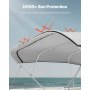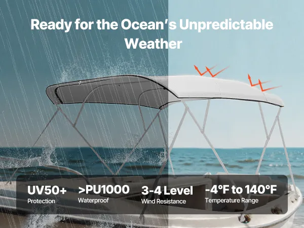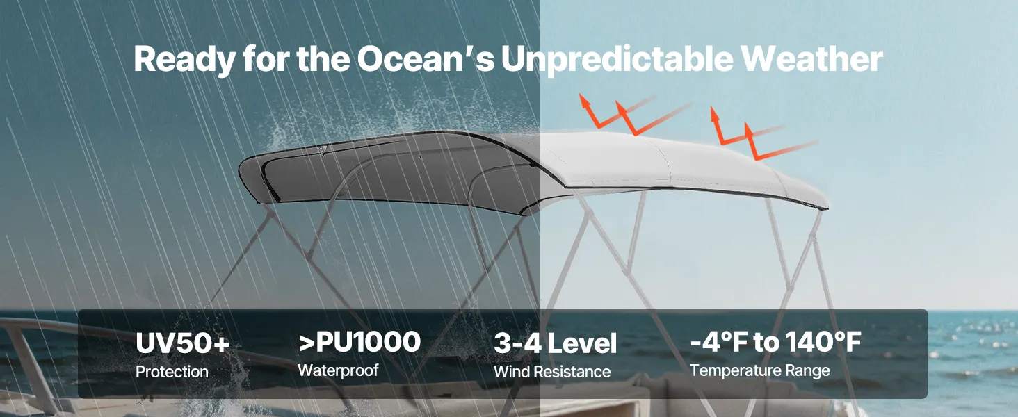 Wind-Resistant Design (3-4 Level): The 4 bow bimini top provides 3-4 level wind resistance with double-stitched seams for added crack resistance. Tensile Strength: Warp 1050 N/5 cm, Weft 850 N/5 cm; Tear Strength: Warp 130 N/5 cm, Weft 100 N/5 cm