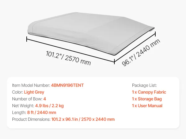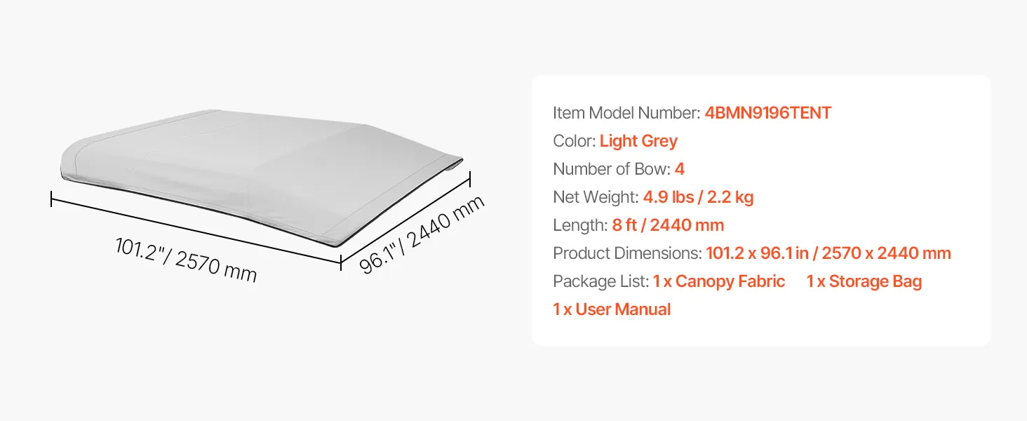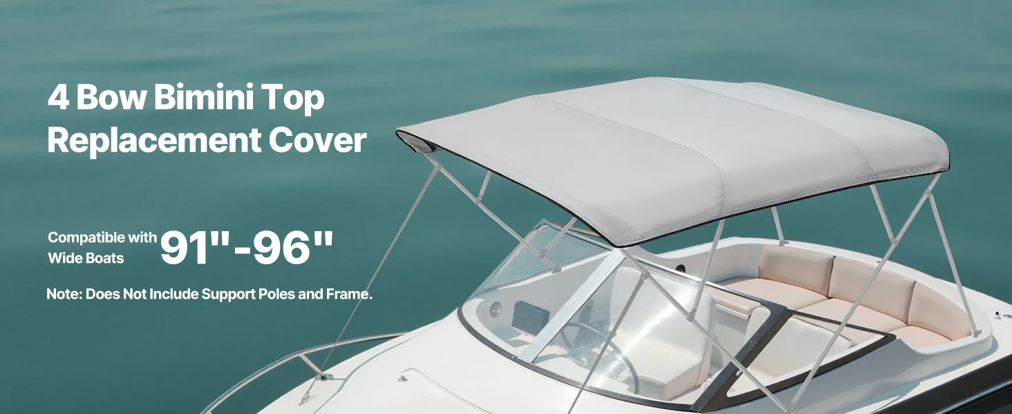 4 Bow Replacement Canopy: This 4 bow bimini top replacement cover fits 91"-96" wide boats. You can choose the right size based on your boat. It can be seamlessly installed on various boat awning frame shapes. Note: Support rods and frame are not included