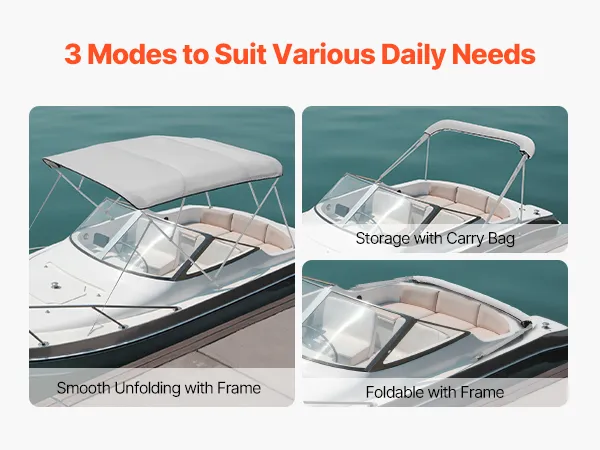 Foldable Design: When paired with the frame, the 4 bow bimini can fold backward or downward, providing two different storage options for your convenience. Note: Fold the canopy when boat speeds exceed 45 mph