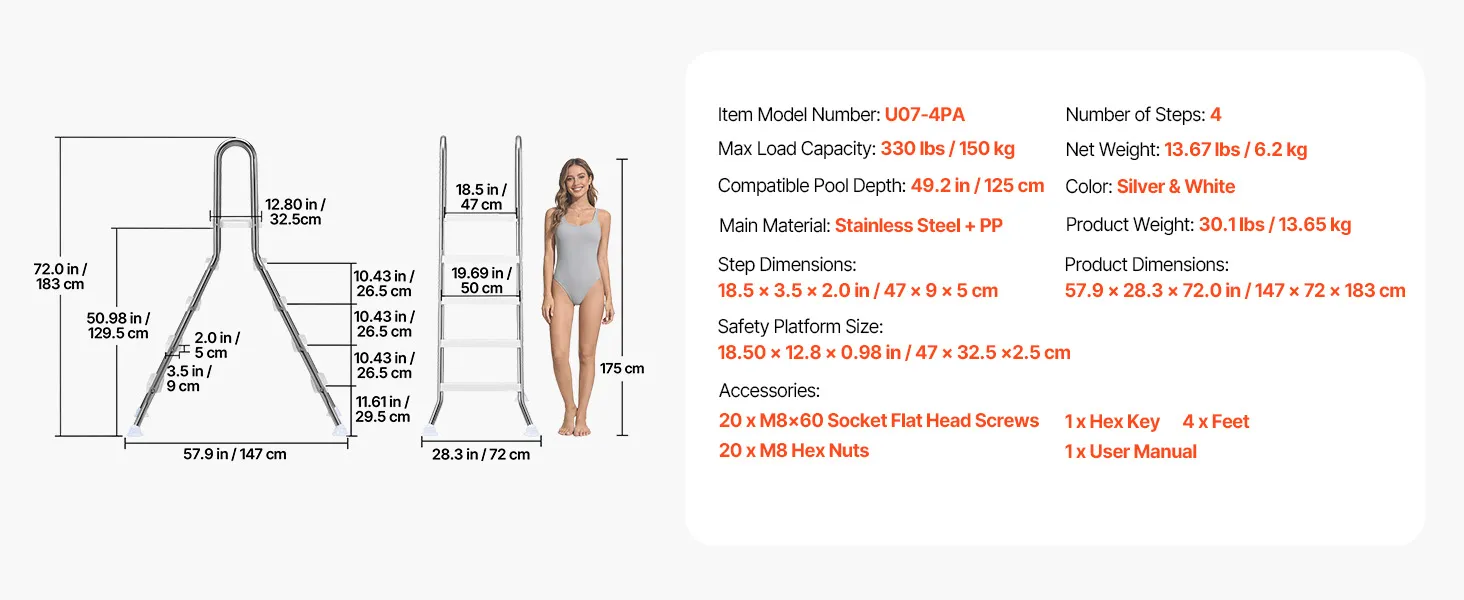 Easy Setup: These pool ladders assemble in just a few simple steps. All necessary parts and screws are included for quick, straightforward, and hassle-free installation