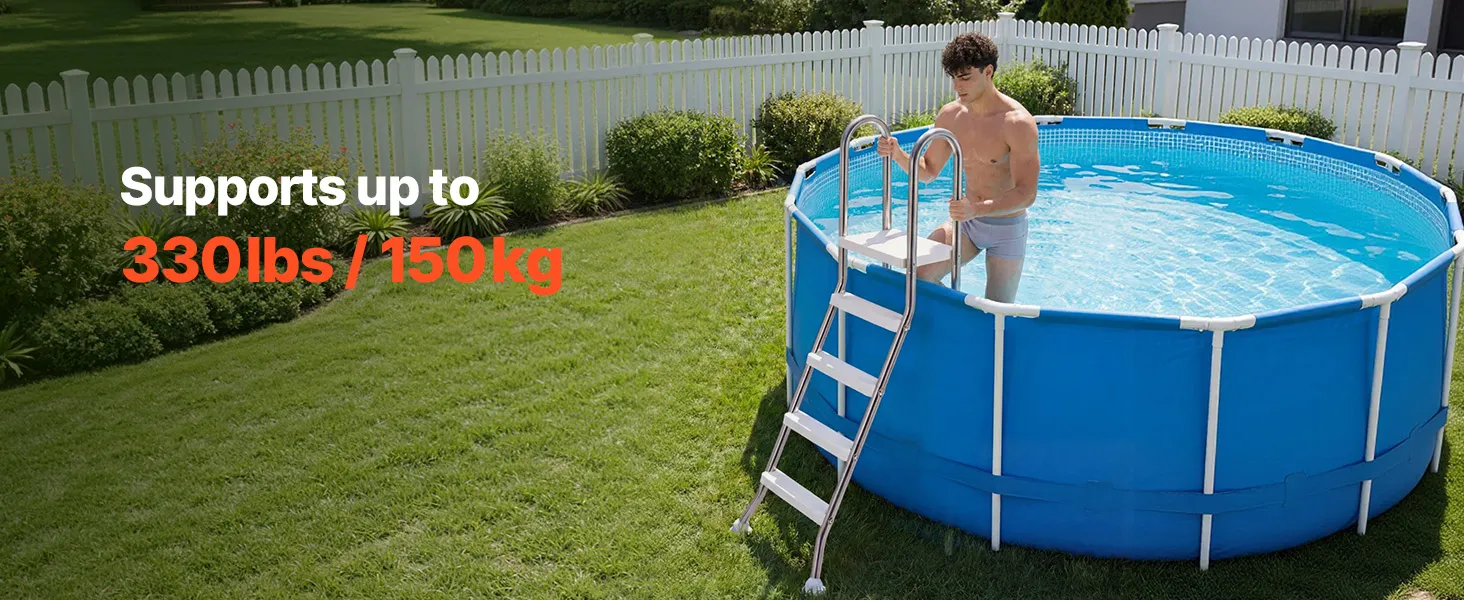 Secure and Stable: These above ground pool steps feature non-slip widened steps and a stable platform that provide secure footing and buffer space when entering or exiting the pool. Reinforced crossbars and anti-slip rubber feet support up to 150 kg