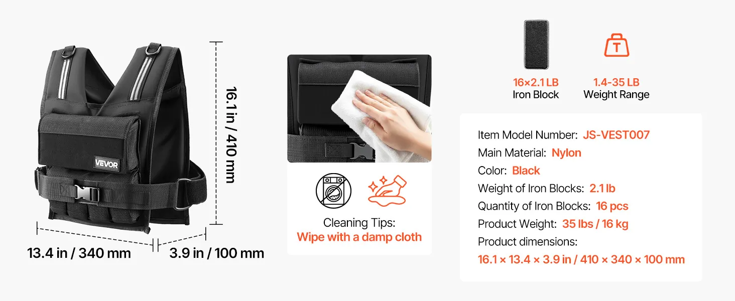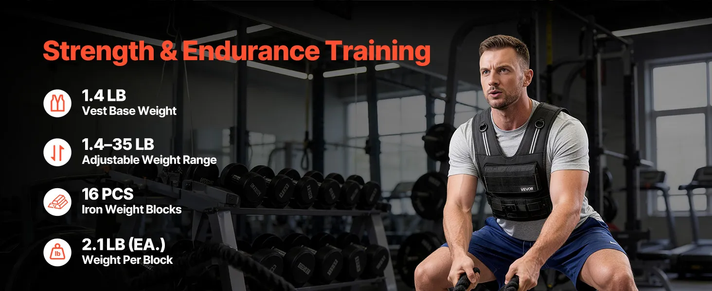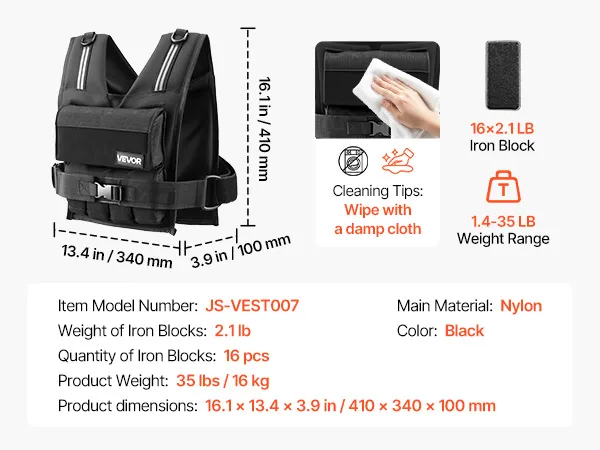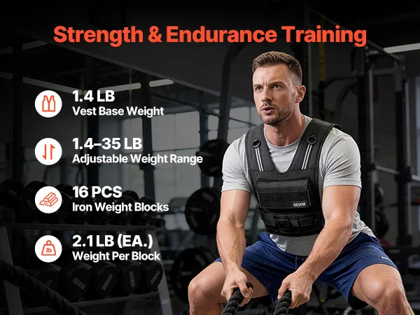Adjustable Weighted Vest: This adjustable weighted vest has a net weight of 1.4 lb and includes 16 x 2.1 lb iron weights. Add or reduce weight easily, allowing you to customize workout intensity for a variety of training goals