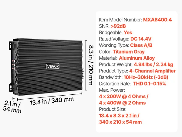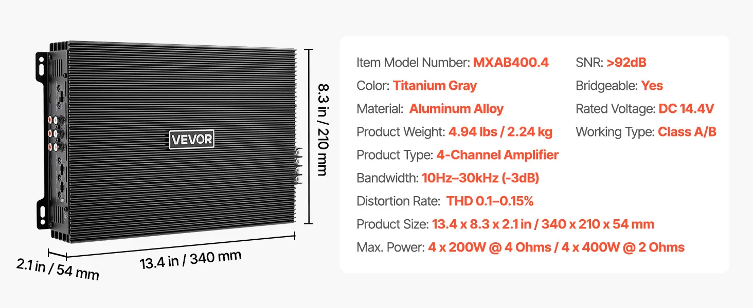 VEVOR Car Audio Amplifier, 4-Channel Bridgeable Car Amplifier, Multichannel Class AB Stereo Amp, Max. 4 x 200W at 4 Ohms / 4 x 400W at 2 Ohms, High Output, for SUVs, Pickups, and Off-Road Vehicles