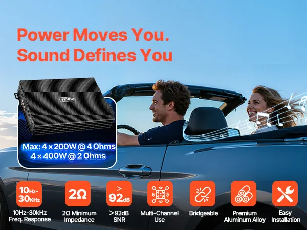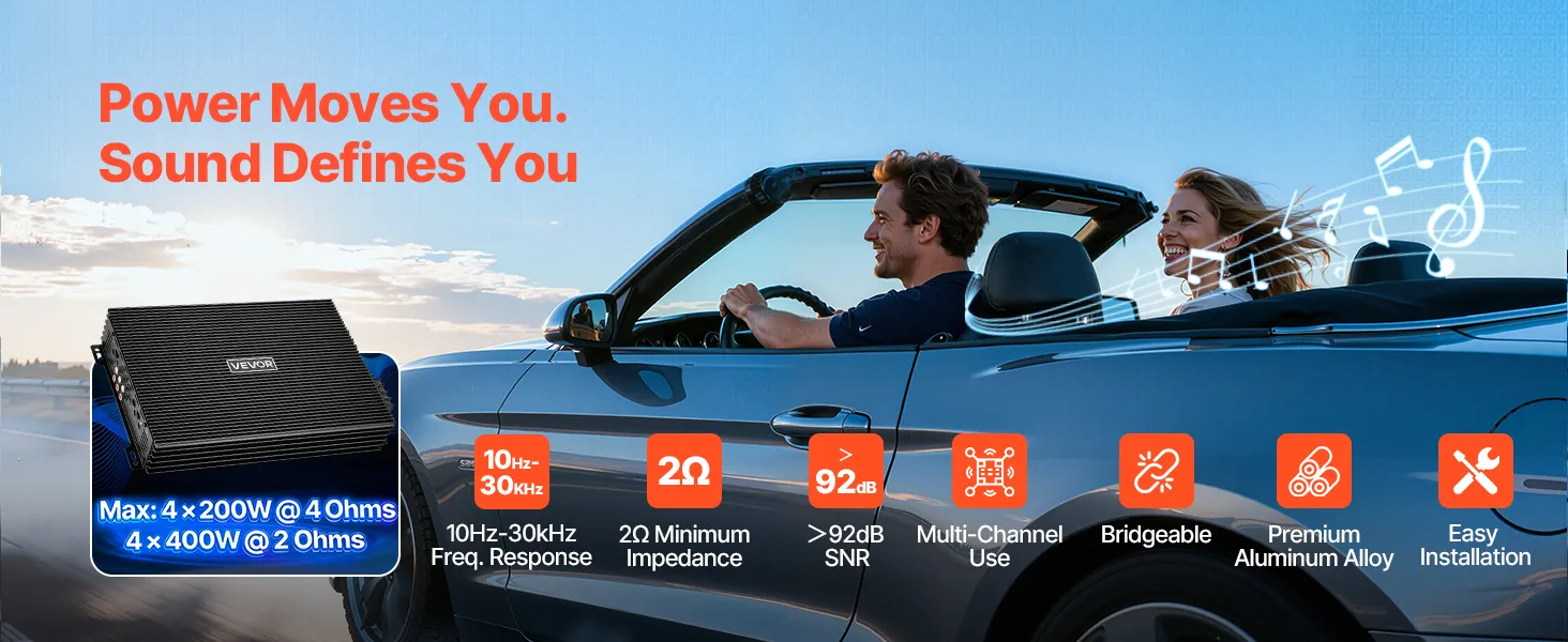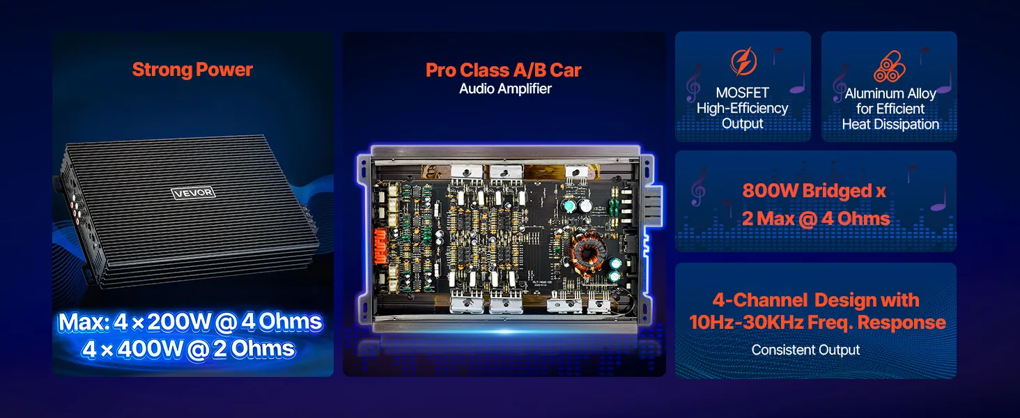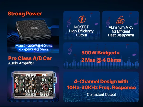 High Power, Strong Performance: This 4-channel Class AB car audio amplifier delivers up to 4 x 200W @ 4 Ohms / 4 x 400W @ 2 Ohms (max) for clean, stable output even at high volume. Enjoy full and powerful in-car audio