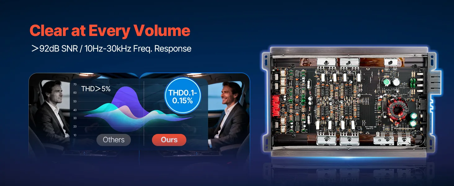 Built with refined low-distortion engineering, this 4 channel amp keeps your music true and transparent, delivering lifelike detail and smooth playback—even when you turn it up.