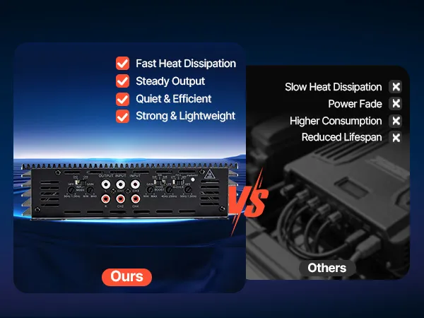 Better Heat Dissipation: The car stereo amp's aluminum alloy shell quickly dissipates heat from internal components for cooler operation and longer lifespan. The built-in fuse ensures reliable current control for dependable operation under all conditions