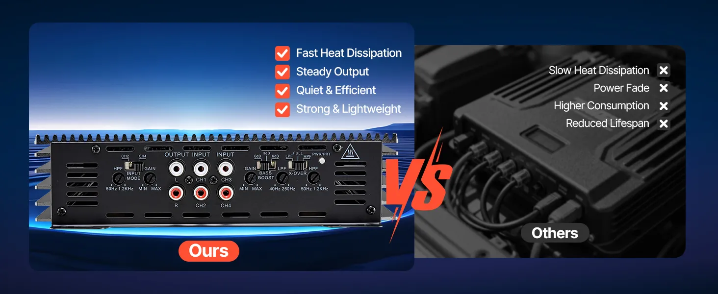 This 4-channel car amplifier combines powerful performance with fast-cooling aluminum construction to deliver clean, rich, and immersive sound on every drive. It refreshes long trips, reduces road fatigue, and elevates your in-car audio experience with lasting clarity and comfort.
