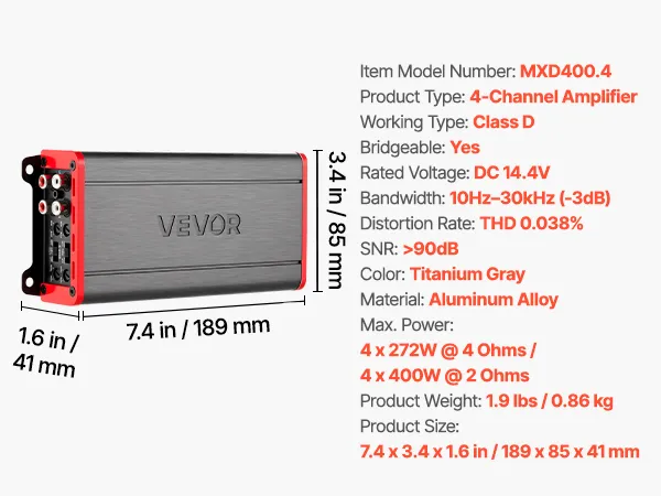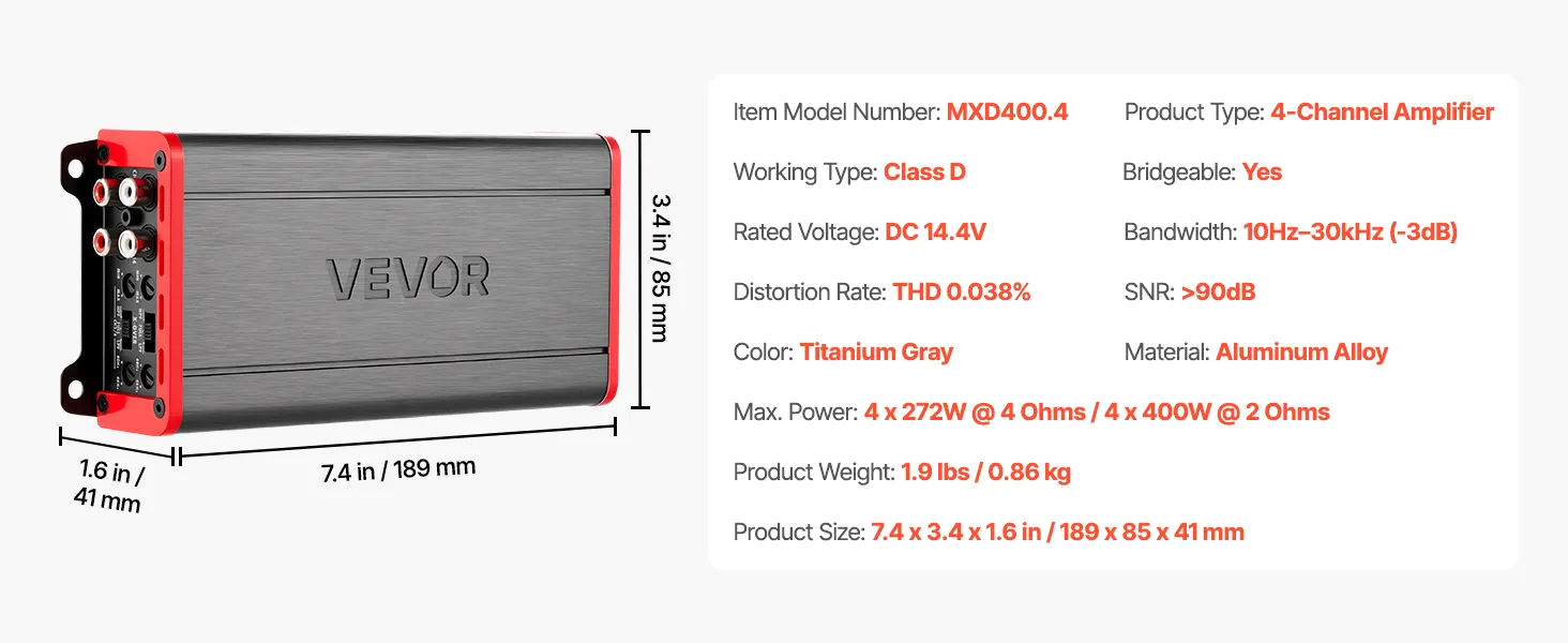 VEVOR Car Audio Amplifier, 4-Channel Bridgeable Car Amplifier, Multichannel Class D Stereo Amp, Max. 4 x 272W at 4 Ohms / 4 x 400W at 2 Ohms, High Output, for SUVs, Pickups, and Off-Road Vehicles