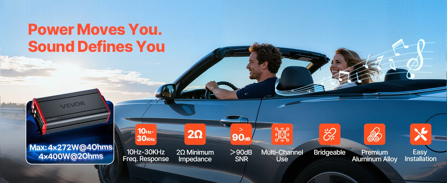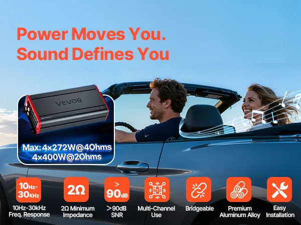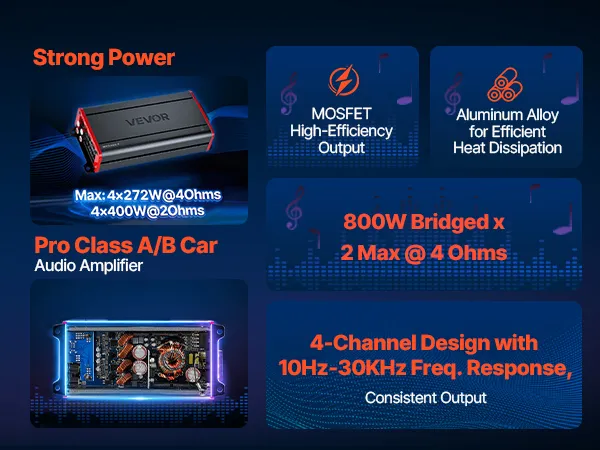High Power, Strong Performance: This 4-channel Class D car audio amplifier delivers up to 4 x 272W @ 4 Ohms / 4 x 400W @ 2 Ohms (max) for clean, stable output even at high volume. Enjoy full and powerful in-car audio
