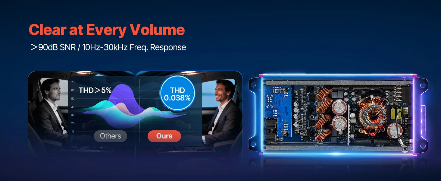 Built with refined low-distortion engineering, this 4 channel amp keeps your music true and transparent, delivering lifelike detail and smooth playback—even when you turn it up.