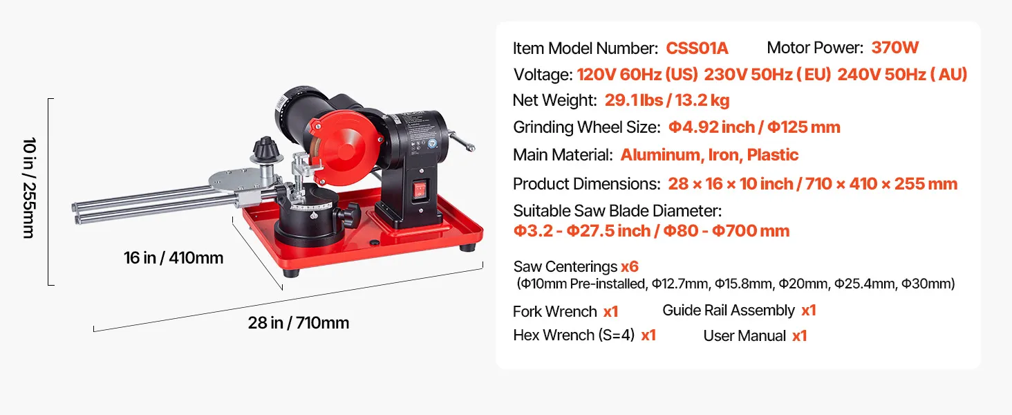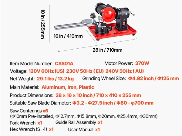 VEVOR circular saw blade sharpener boasts a powerful 370W motor for efficient blade sharpening. Cooperated with different-sized saw centerings and a 125mm grinding wheel, it tackles dullness and wear with ease, covering diverse blades sharpening needs.