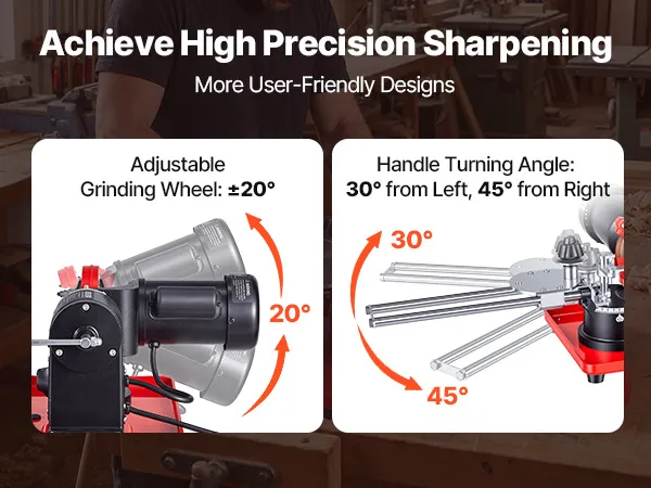 Easy Adjustment: Our rotary angle mill grinder's grinding wheel can be adjusted up and down by 20°. You can also turn the handle 30° to the left and 45° to the right, allowing flexible angle control and ensuring consistent sharpening results