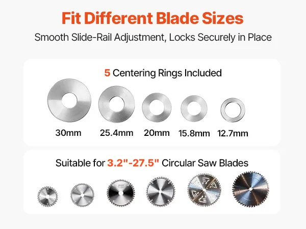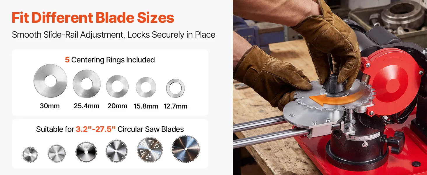 Fit Different Blade Sizes: Equipped with different sized saw centerings to accommodate circular saw blades from Φ80mm to Φ700mm. Combined with a smooth slide-rail adjustment system, it locks securely in place for stable and precise sharpening