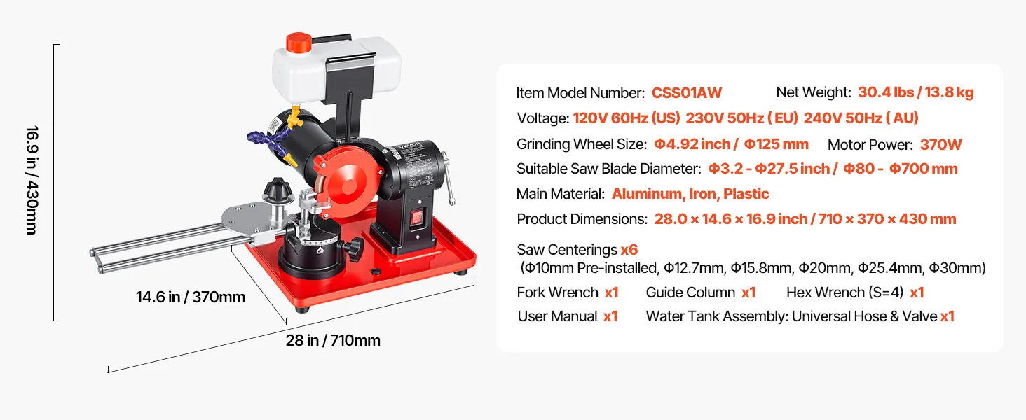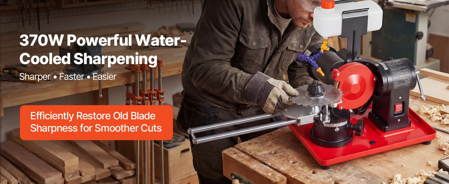 VEVOR 370W circular saw blade sharpener features different-sized saw centerings, a 125mm grinding wheel, and a built-in water tank for cooling. It efficiently restores dull and worn blades while meeting a wide range of sharpening needs.