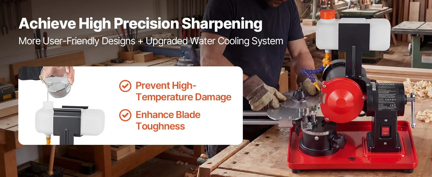 Our circular blade sharpener comes with a water tank that effectively cools down the grinding wheel during operation, preventing high-temperature damage and enhancing durability.