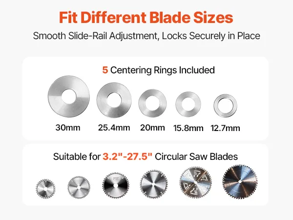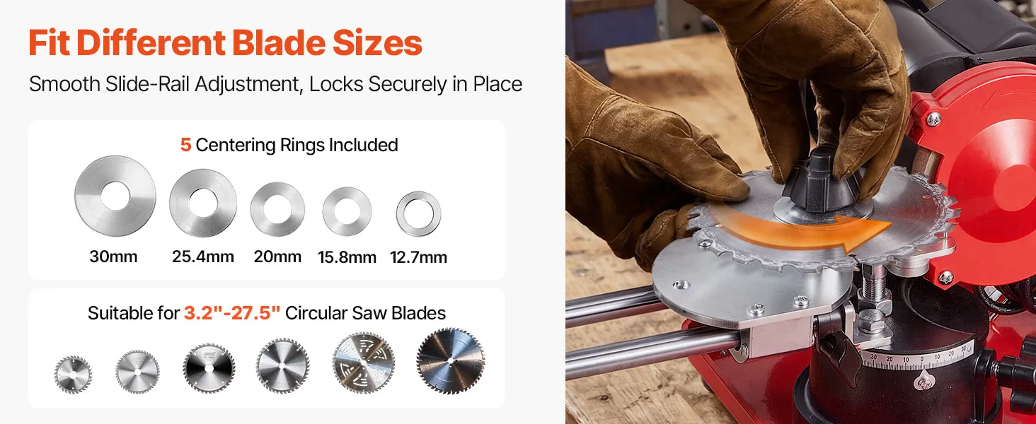 Wide Compatibility: Equipped with different sized saw centerings to accommodate circular saw blades from Φ80mm to Φ700mm. Combined with a smooth slide-rail adjustment system, it locks securely in place for stable and precise sharpening