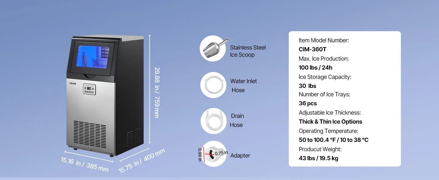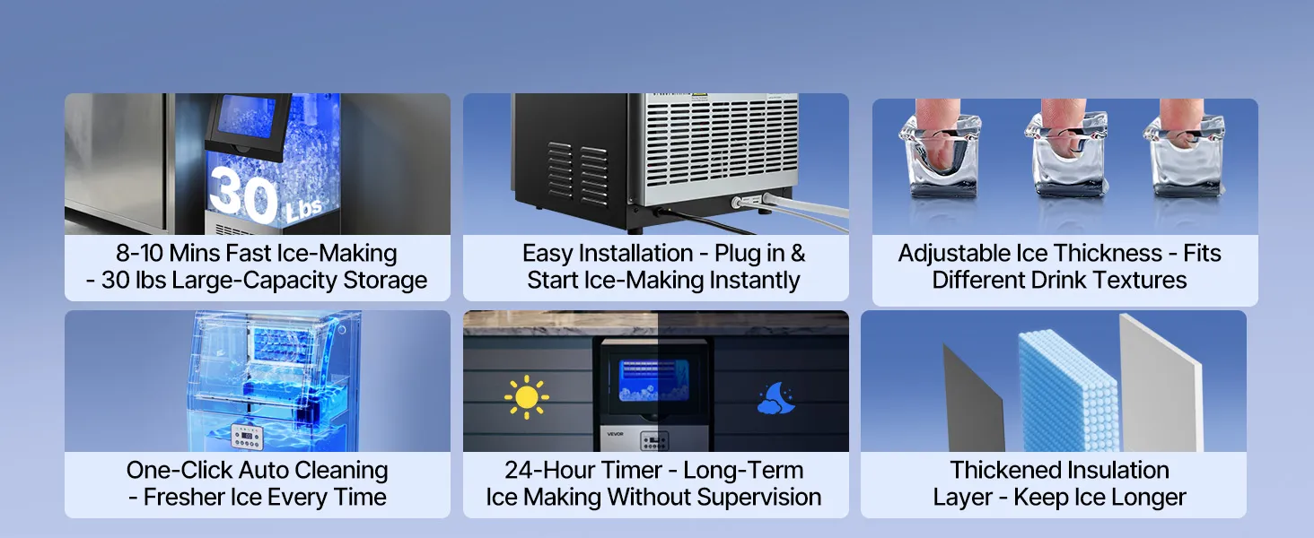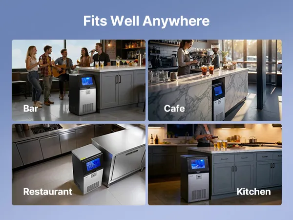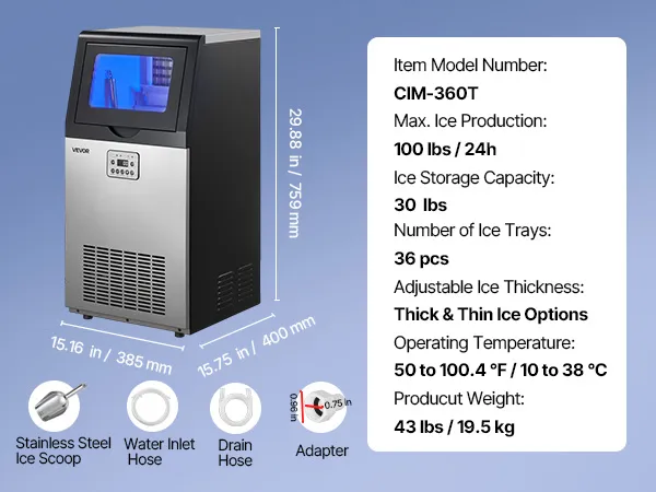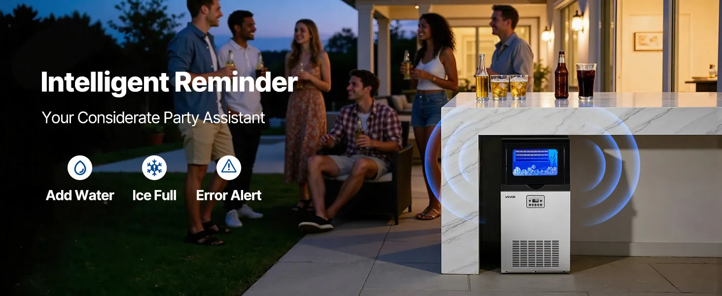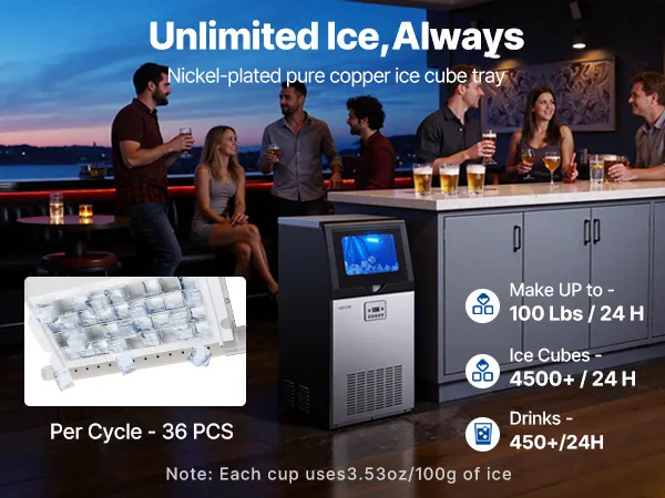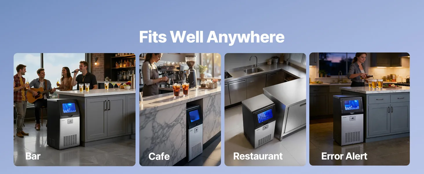 This ice maker makes 36 cubes in 8-10 minutes and up to 100 lbs/day. Low energy use, low noise, and a corrosion-resistant, easy-clean stainless-steel body. The LED panel adjusts ice size/time, monitors temperature, and supports auto-cleaning and a timer. Use it freestanding or built-in under the counter—ideal for restaurants, bars, offices, outdoor parties, and home gatherings.