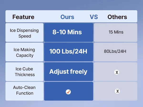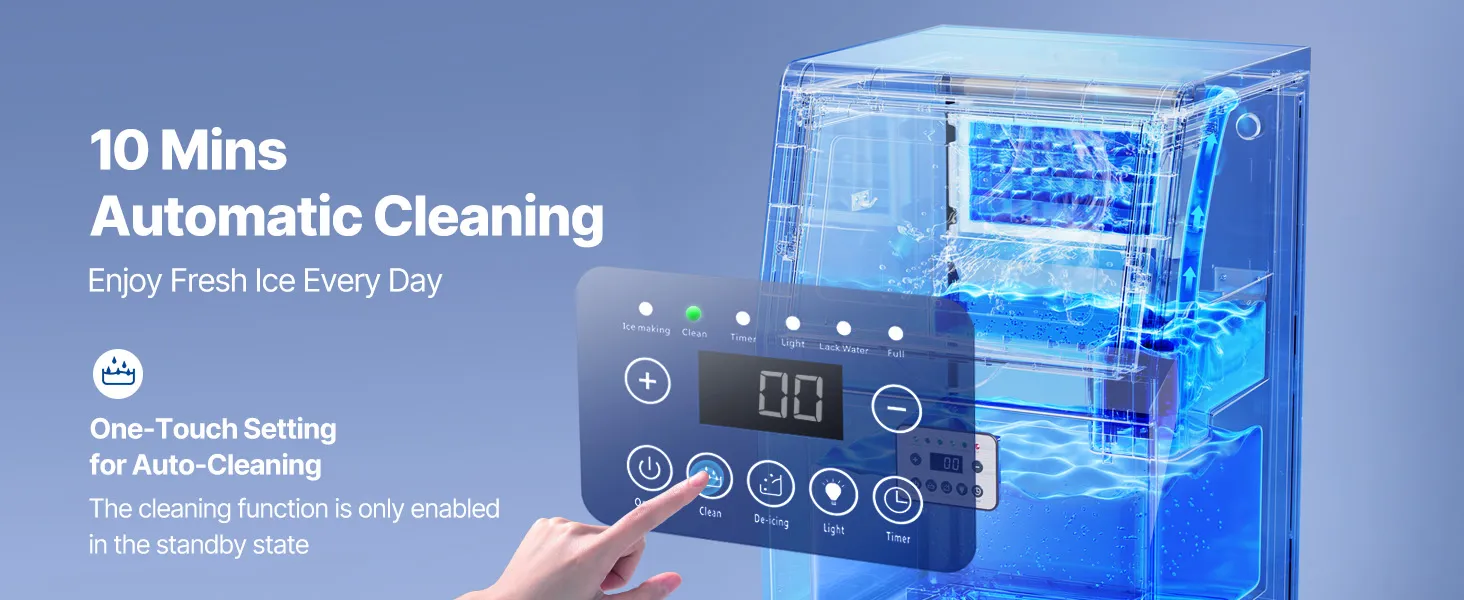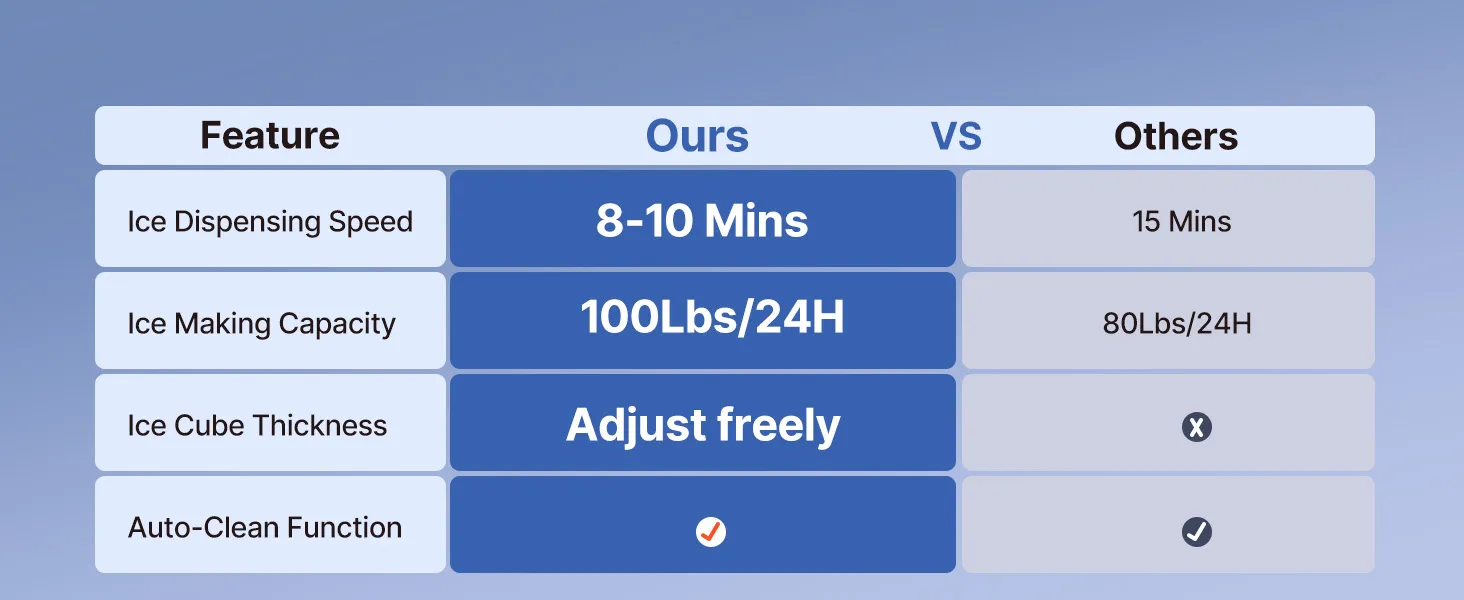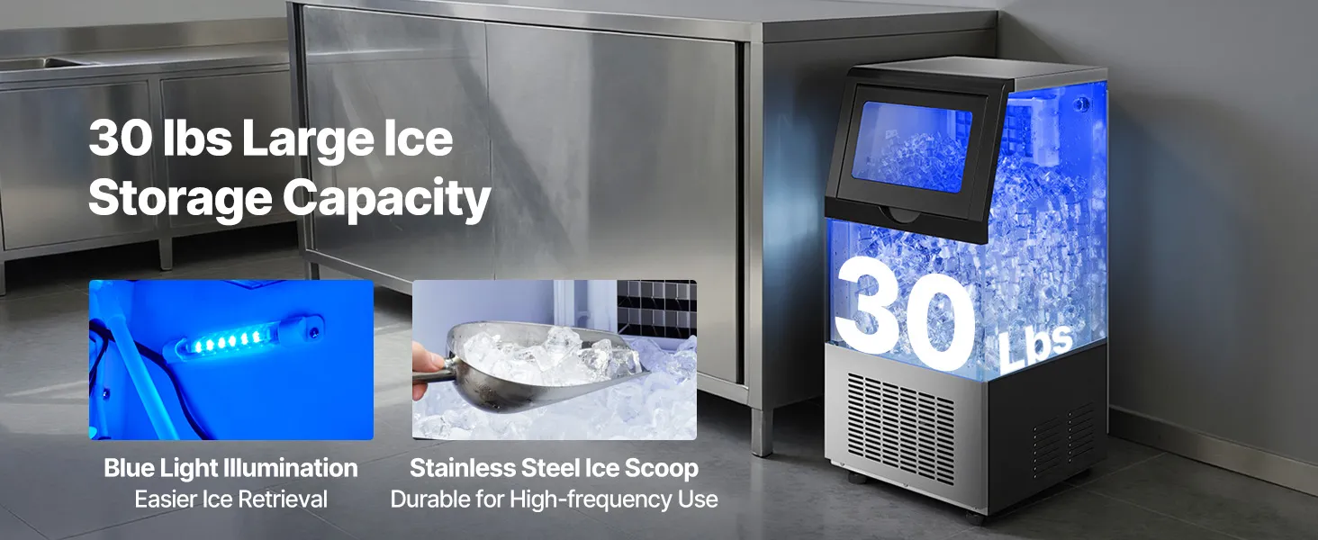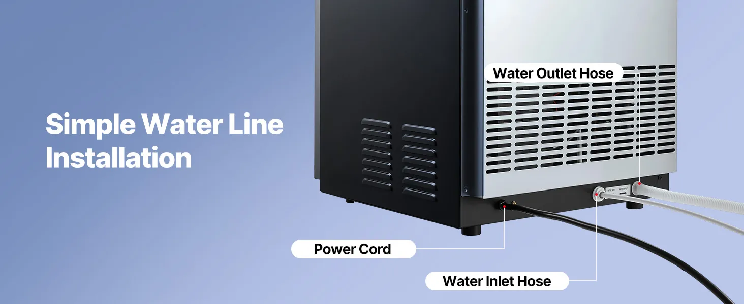 This ice maker makes 36 cubes in 8-10 minutes and up to 100 lbs/day. Low energy use, low noise, and a corrosion-resistant, easy-clean stainless-steel body. The LED panel adjusts ice size/time, monitors temperature, and supports auto-cleaning and a timer. Use it freestanding or built-in under the counter—ideal for restaurants, bars, offices, outdoor parties, and home gatherings.