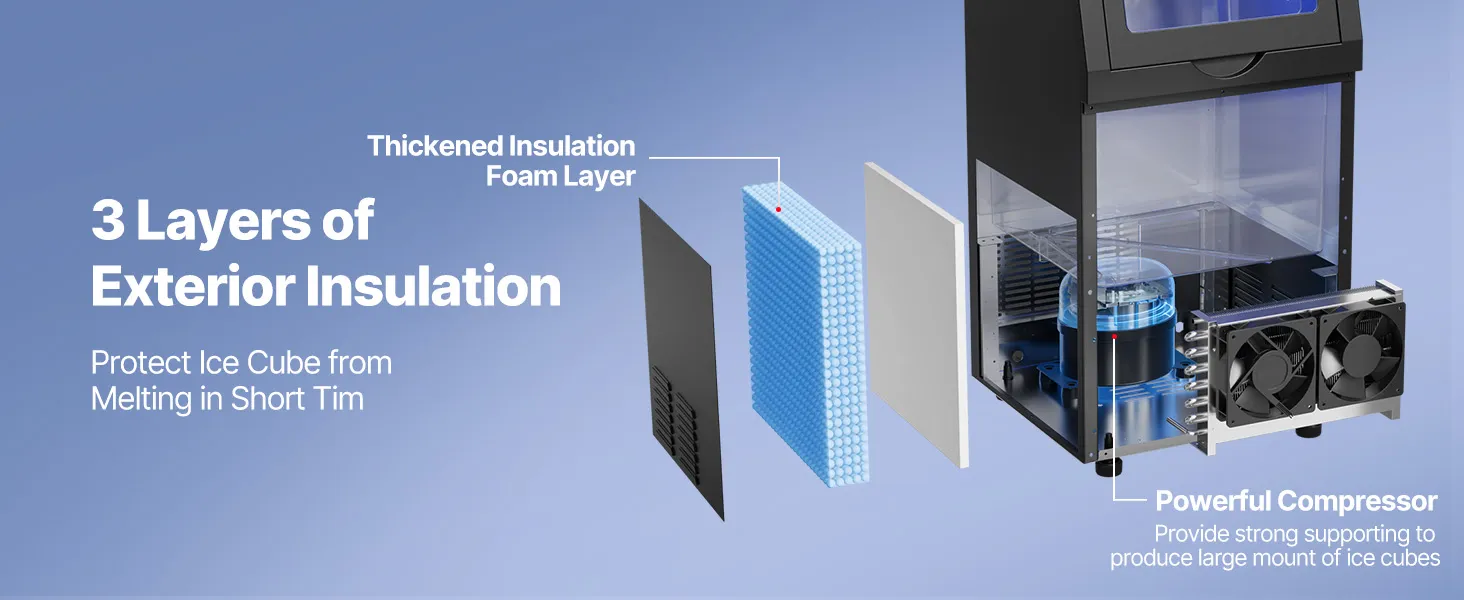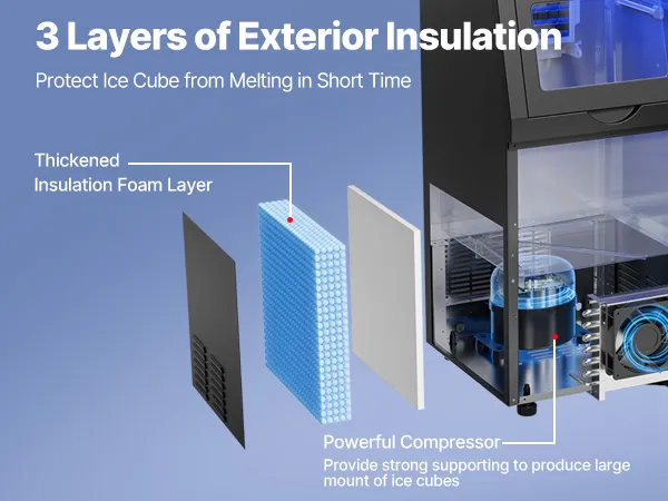 A: Recommended to use purified clean water to make ice. In addition, the dust on the condenser needs to be cleaned frequently to ensure that dust does not enter the ice machine and to prevent excessive accumulation of dust from causing poor heat dissipation and damaging the compressor.