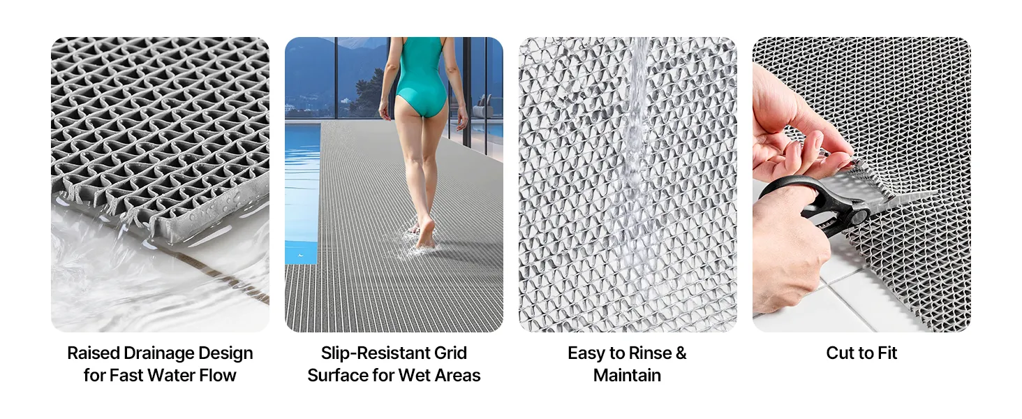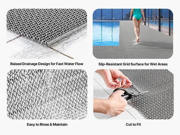 This pool drain floor mat channels water away quickly to avoid pooling and keep the surface dry.