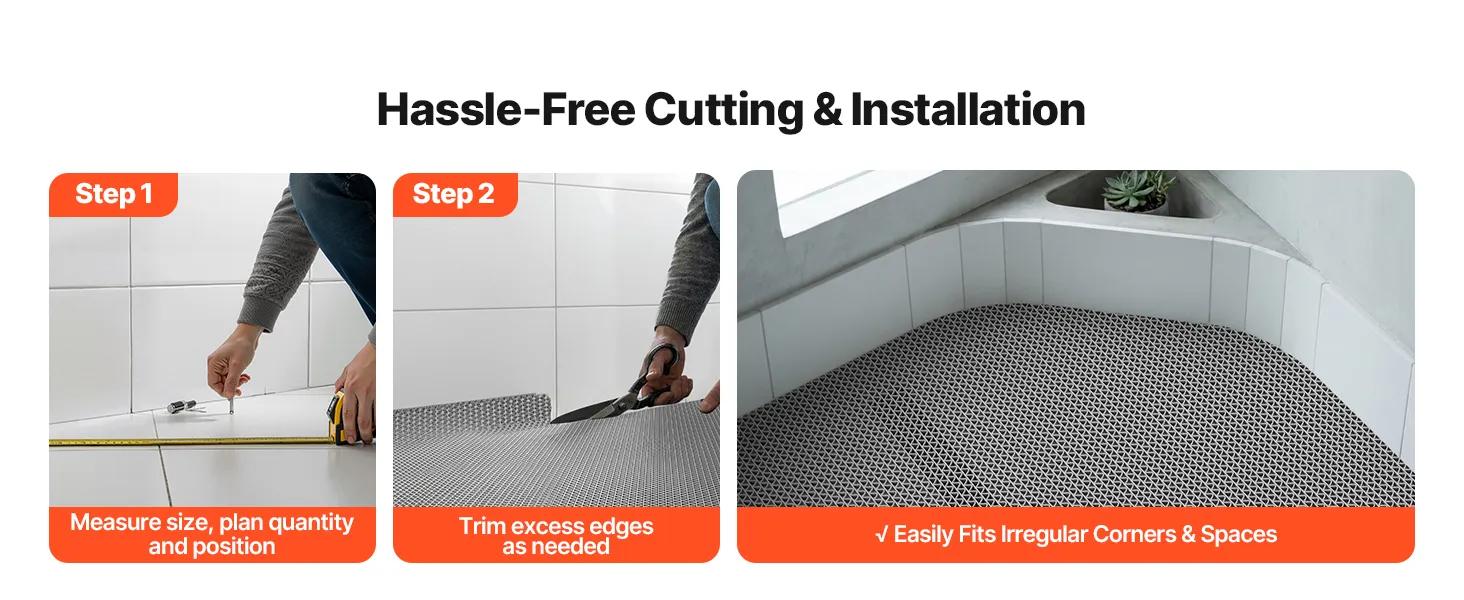 Roll-Out Design, Easy Installation: This water drain flooring mat comes in a one-piece roll, requiring no assembly. Just unroll and place it, then cut to length to fit your space. Fewer seams mean faster installation and a clean, seamless look