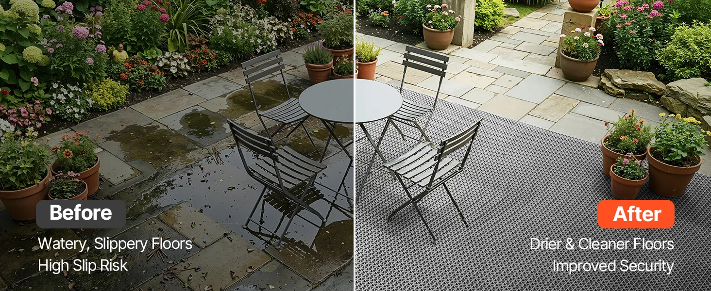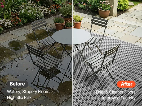 Waterproof & Slip-Resistant: This drainage floor mat features a hollow water-channel design that reduces surface water buildup while increasing traction in wet areas. It helps lower slip risks and creates a secure walking surface