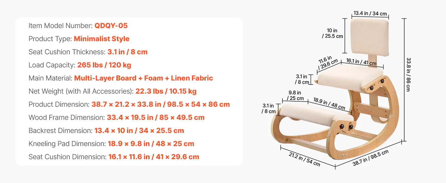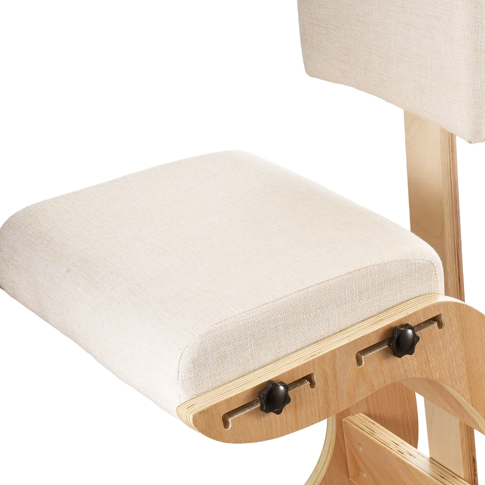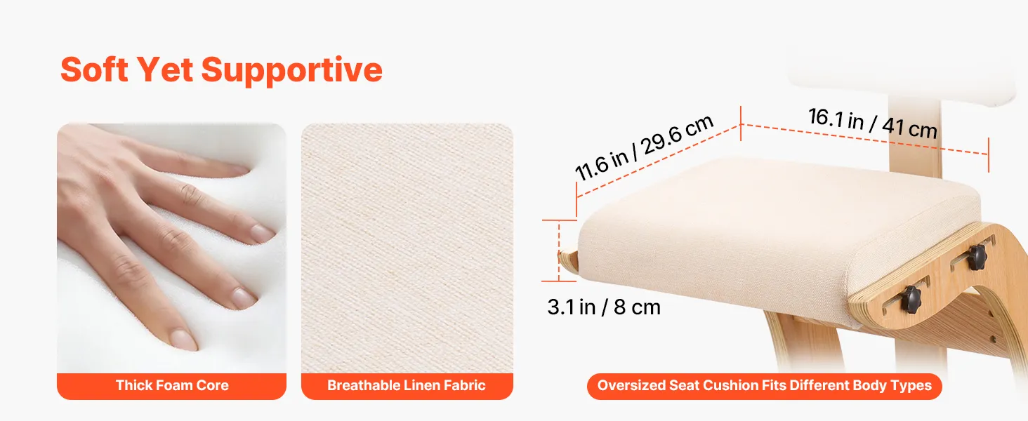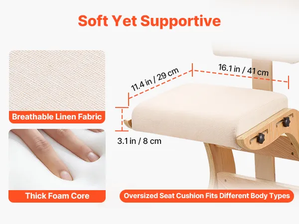 Thick Cushions: Seat and kneeling pads of the kneeling office chair use foam to support hips and knees for lasting comfort, help hold their shape over time, and the linen fabric provides airflow and heat release for a cooler, drier sitting feel