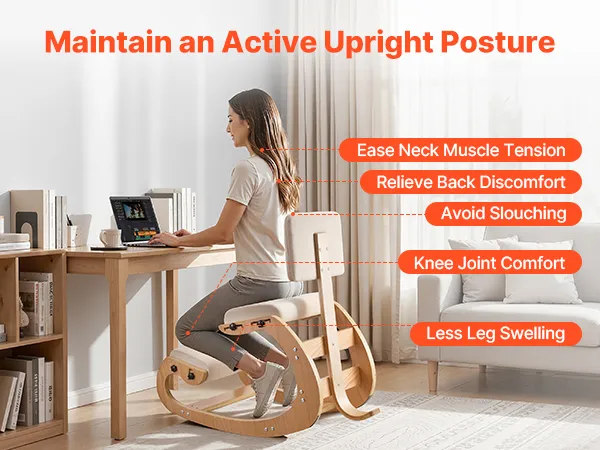 This kneeling chair uses a kneeling design that encourages an active upright posture. Gentle rocking helps you avoid staying in one stiff position for too long. A comfortable alternative to traditional office chairs that helps build better sitting habits.