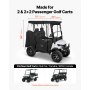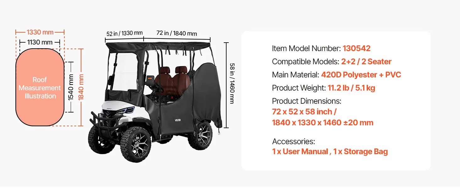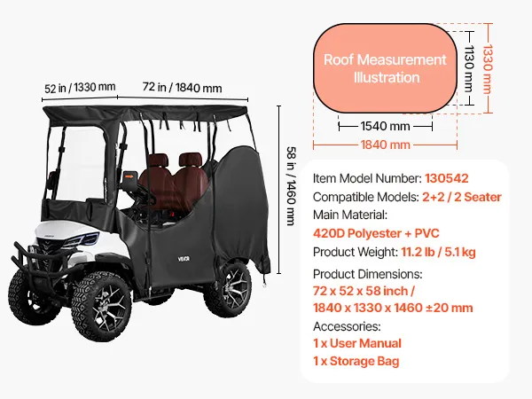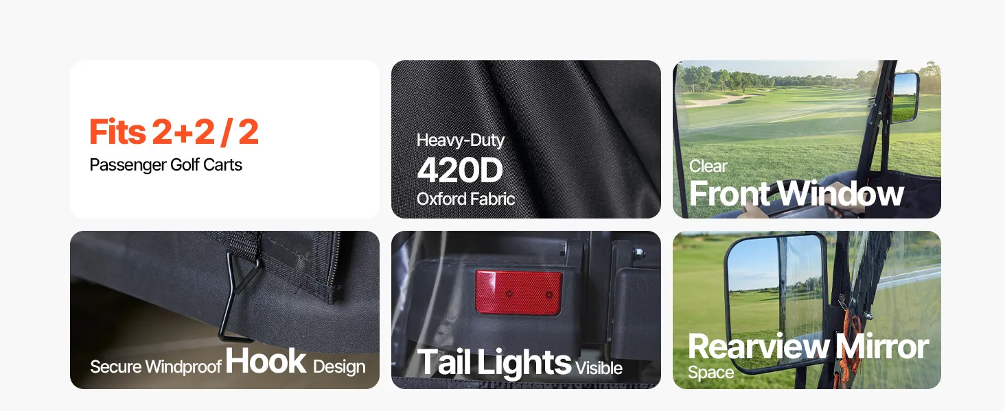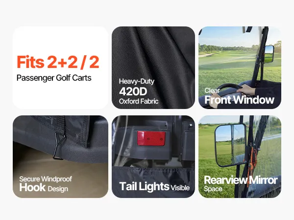 Compatible with most 2&2+2 seat golf carts, this golf cart cover uses 420D high-density polyester fabric with PVC coating to handle rain, dust, and sun exposure. A clear front windshield, uncovered tail lights, wind hooks, roll-up doors, mirror openings, rust-resistant zippers, and a clear "Front" mark support easier daily use.