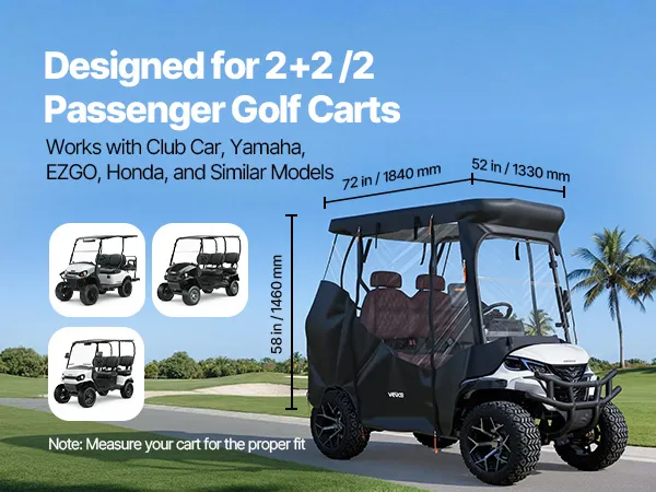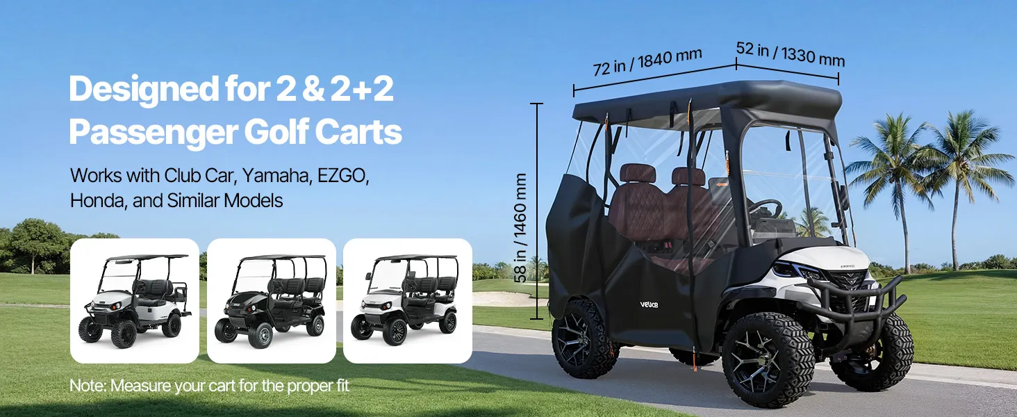 Wide Fit Coverage: Fits most 2&2+2 seat golf carts from Yamaha, EZGO, Club Car, and Honda. This golf cart hard cover supports roof lengths up to about 72 inch/1.83 m, covering common cart sizes with a close and stable fit. Please measure your cart before purchase to ensure proper sizing