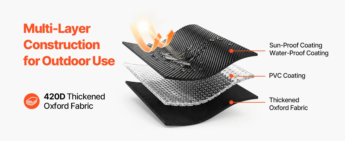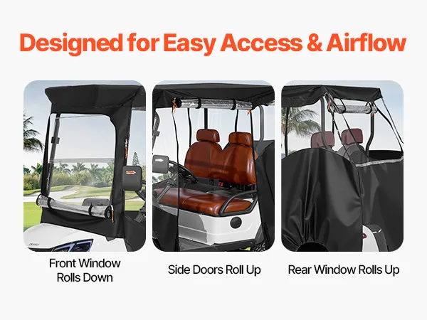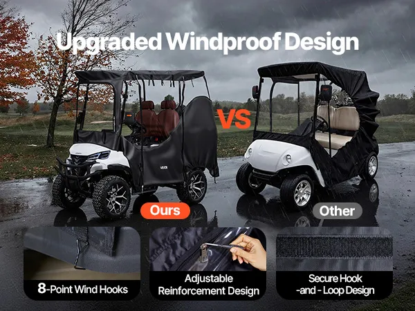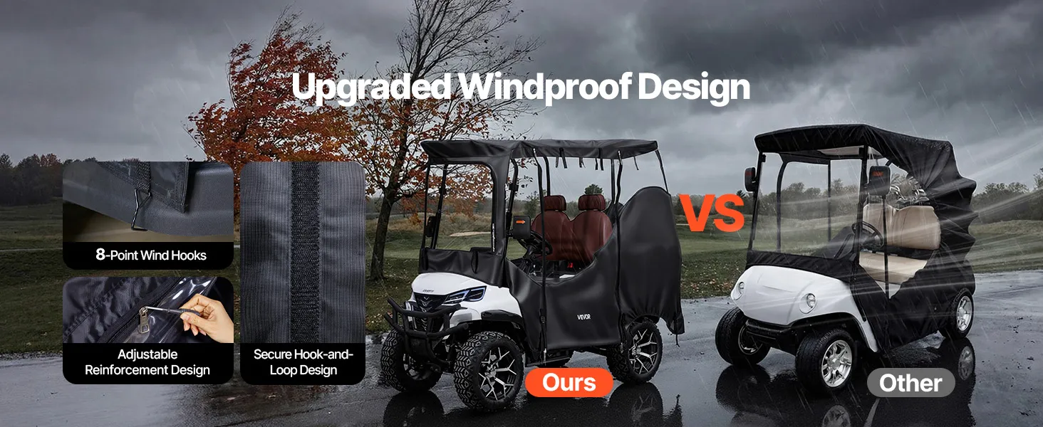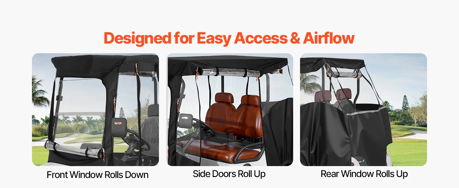 Wind Hooks & Doors: Equipped with eight adjustable wind hooks and four roll-up doors, this golf cart rain cover stays more stable during driving while supporting easy entry and exit. The balanced design helps keep the cover secure on the cart while allowing quick access when needed outdoors