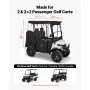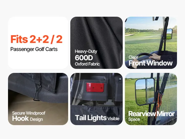 Compatible with most 2&2+2 seat golf carts, this golf cart cover uses 600D high-density polyester fabric with PVC coating to handle rain, dust, and sun exposure. A clear front windshield, uncovered tail lights, wind hooks, roll-up doors, mirror openings, rust-resistant zippers, and a clear "Front" mark support easier daily use.
