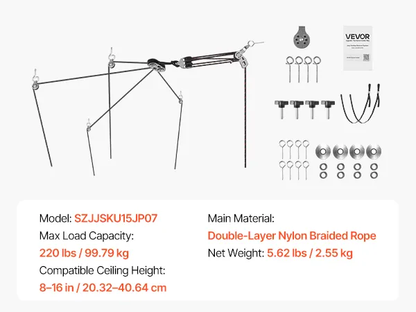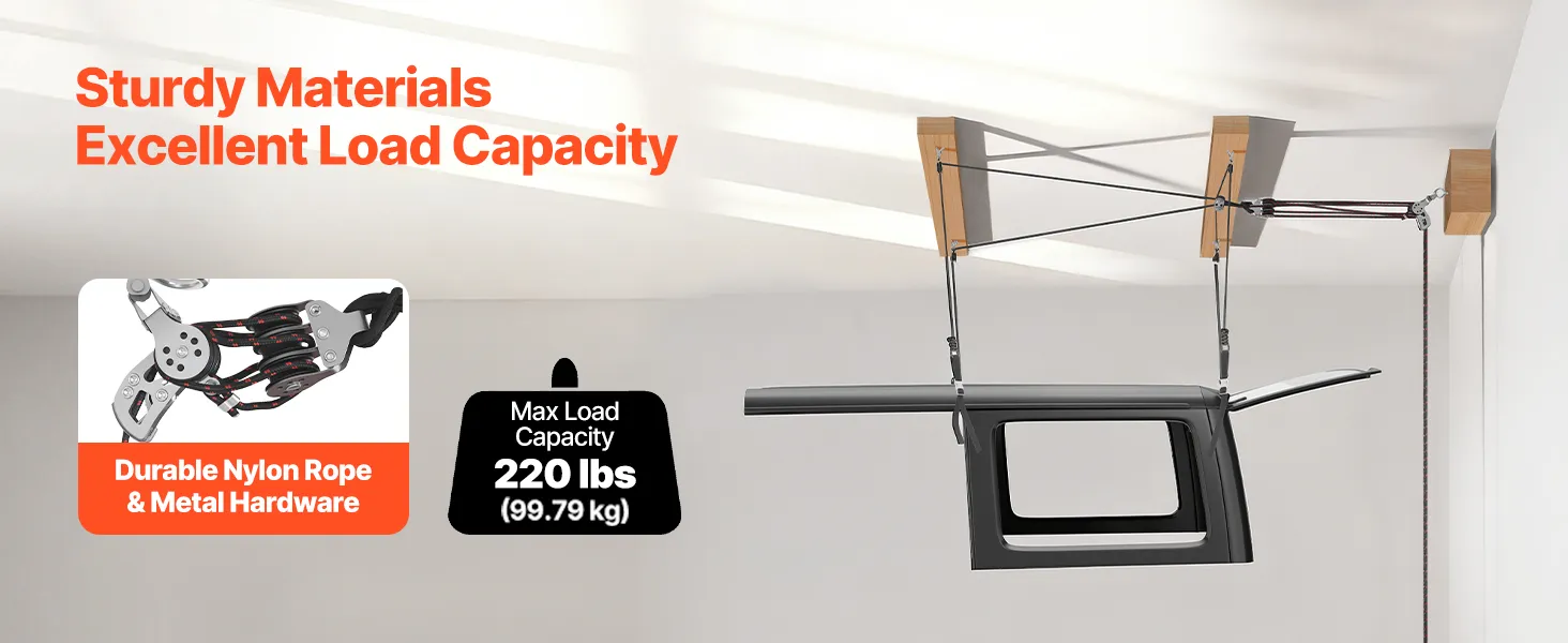 Heavy-Duty Construction: Made with durable nylon rope and premium metal hardware, this jeep hardtop hoist supports up to 220 lbs / 99.79 kg, handling heavy Jeep hardtops with long-lasting reliability