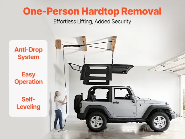 Effortless One-Person Operation: This hard top remover lift allows easy one-person removal and storage of the hardtop. It features an automatic locking anti-drop system and a self-leveling design to ensure a secure lifting