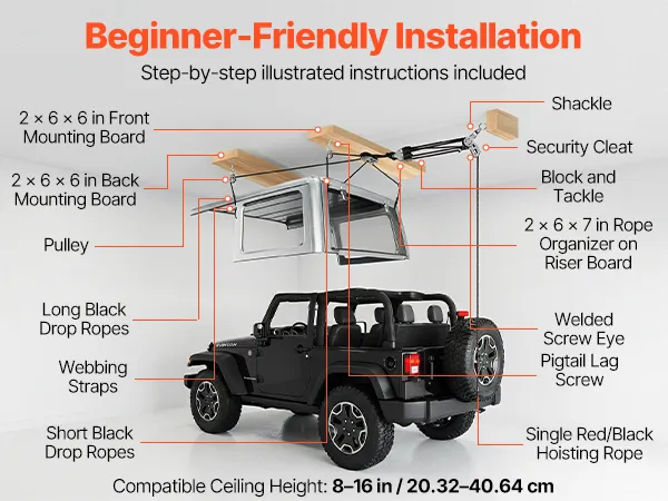 This jeep wrangler hard top removal lift fits ceilings from 8 to 16 in (20.32 to 40.64 cm). It comes with clear, step-by-step illustrated instructions for easy installation.