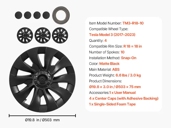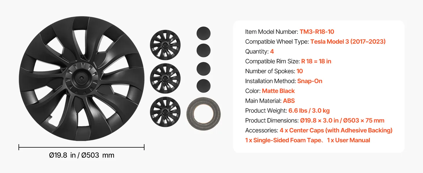 Tesla Model 3 Specific: The hubcap wheel cover is designed for the 18-inch wheels of the 2017-2023 Tesla Model 3, including separate left and right side wheel covers. It is not compatible with other models or wheel sizes