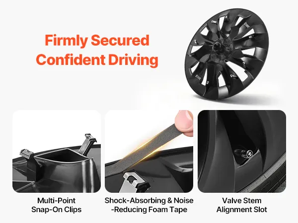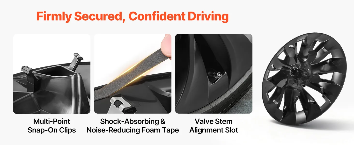 Secure Fit: Featuring a multi-point snap-on system custom-designed for the Model 3 wheel contours, this wheel rim cover hubcap stays firmly in place even at high speeds. Pre-installed cushioning tape helps maintain a snug fit and reduces driving noise