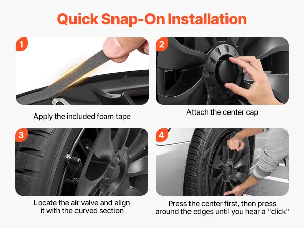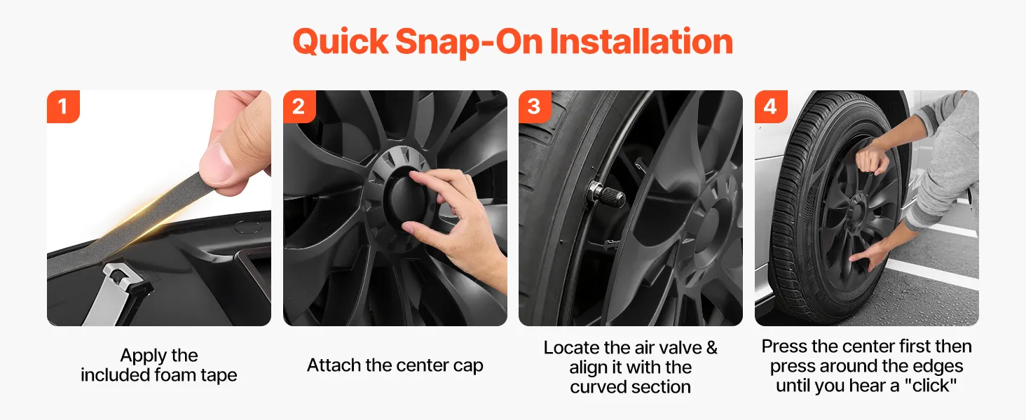 Snap-On Installation: Simply apply the included cushioning tape, align the hub cap with the valve stem, and press firmly until it clicks into place. The left and right wheels are symmetrically designed and must be distinguished