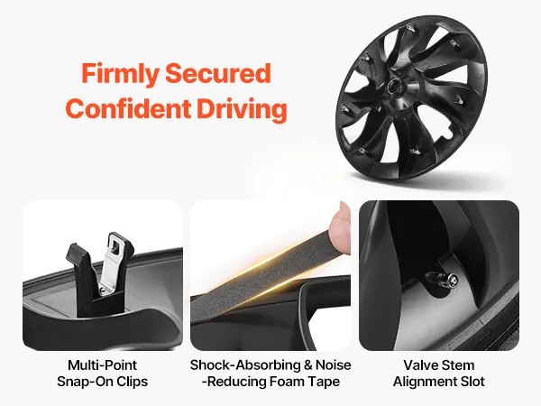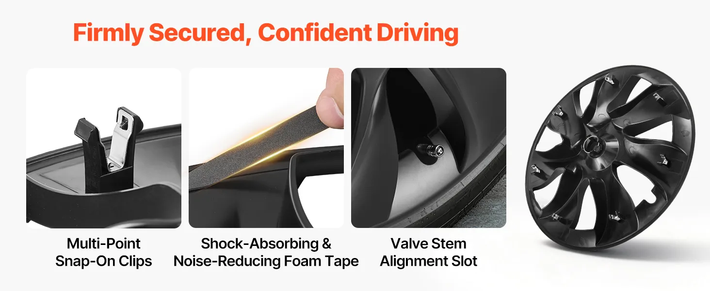 Secure Fit: Featuring a multi-point snap-on system custom-designed for the Model Y wheel contours, this wheel rim cover hubcap stays firmly in place even at high speeds. Pre-installed cushioning tape helps maintain a snug fit and reduces driving noise