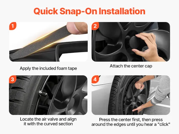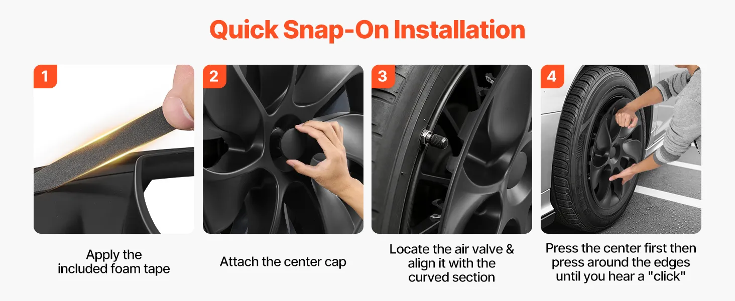 Snap-On Installation: Simply apply the included cushioning tape, align the hub cap with the valve stem, and press firmly until it clicks into place. The left and right wheels are symmetrically designed and must be distinguished