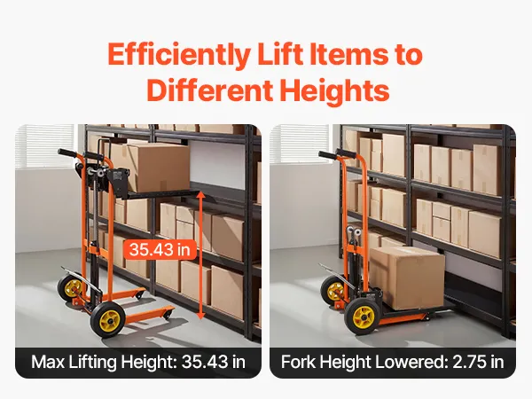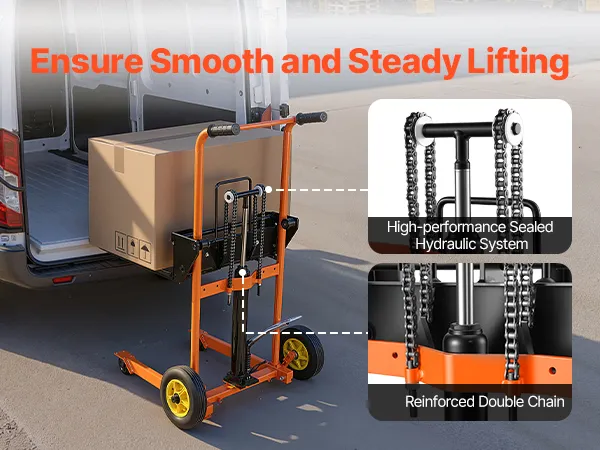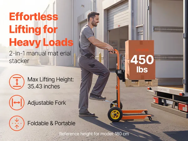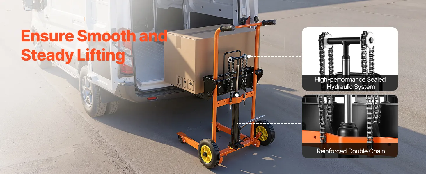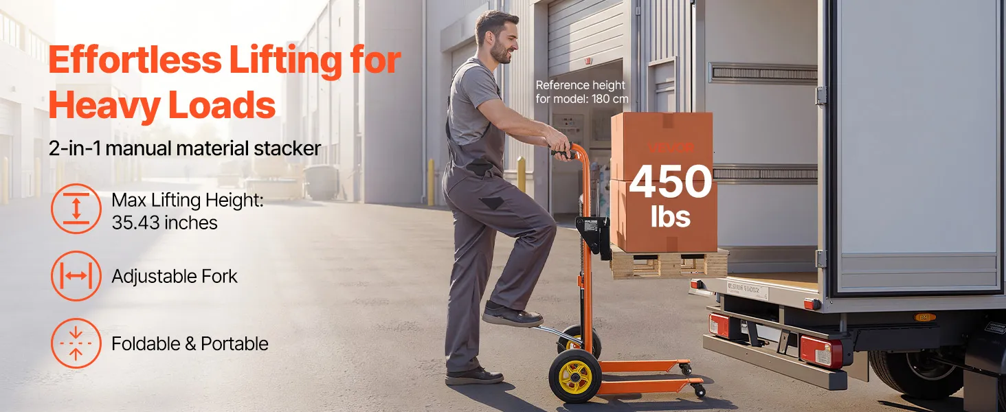 Powerful Lifting Performance: This manual material stacker uses high-strength carbon steel with reinforced lifting ribs for added stability. The foot pedal hydraulic system and dual chains lift loads up to 450 lbs from 2.75 in to 35.4 in with steady control