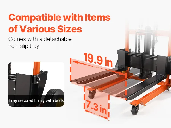 Our material lifting stacker is equipped with a high-performance sealed hydraulic pump, ensuring stable lifting with every task. The forks adjust from 7.3 to 19.9 inches wide, ideal for various loading tasks.