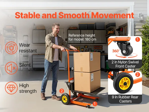 Two-in-one Mode: Switch between stacker and hand truck modes! The non-slip tray keeps items secure while moving. With durable wheels, this winch stacker moves smoothly and quietly on all surfaces, making it great for multiple uses