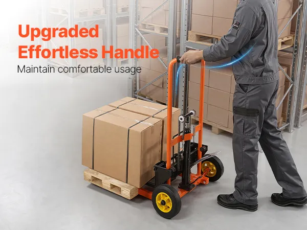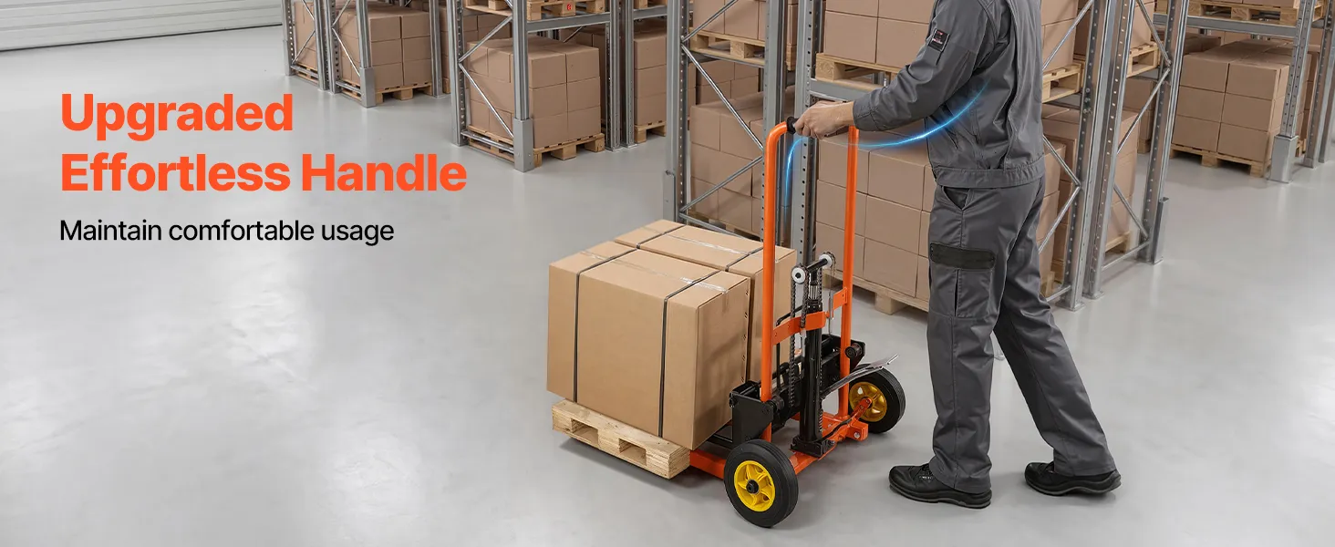 Switch between lifter and hand truck modes! Effortlessly move heavy loads with two durable 9-inch rear wheels and two 2-inch front wheels. Our pallet stacker is ideal for smooth transport on any surface.