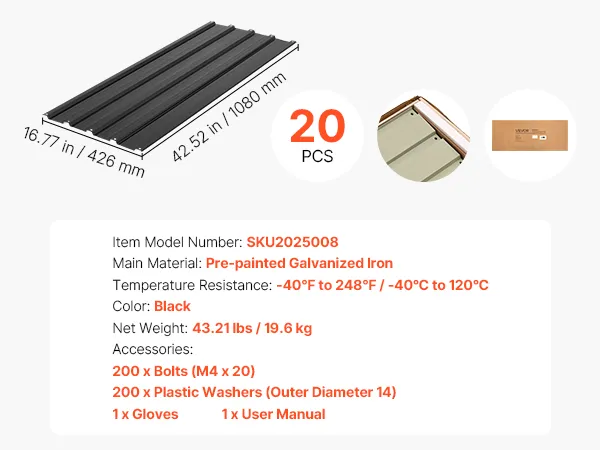 VEVOR Metal Roof Panels, 20Pcs 9.2 sq.m Galvanized Steel Roofing Panels, High Impact Corrugated Tin Gazebo Top with Screws, Gloves, Heavy Duty for Gazebos, Chicken Coop Sheds Stables Patio, Black